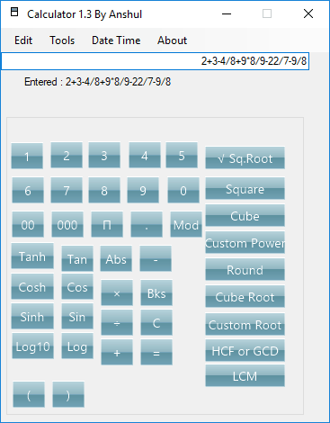 Aparte de esto, también se puede calcular LCM , HCF, enésima potencia de un número, enésima surd de un número, Cálculos trigonométricos , etc.