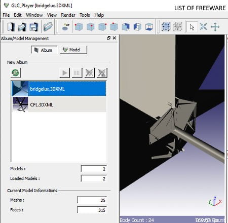GLC_Player es un software gratuito de código abierto visor 3DXML para Windows, Linux y macOS. En este software, puede ver y analizar modelos 3D presentes en formatos de archivo 3DXML, OBJ, 3DS, STLL, OFF, y DAE . También puede cargar varios archivos 3DXML a la vez y alternar entre ellos desde la sección Nuevo álbum . Para ver y analizar un modelo 3D, ofrece múltiples herramientas de visualización junto con algunos modos de renderizado. Veamos las principales funciones de visualización de este software.