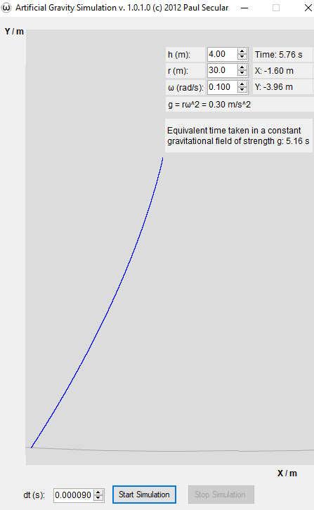 Después de fijar los valores de estas opciones, puede pulsar la opción Iniciar Simulación para visualizar el efecto de la gravedad artificial sobre la masa puntual que cae.