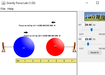 El programa es muy fácil de usar y contiene dos cuerpos con masas m1 y m2, respectivamente. En su interfaz hay un control deslizante para cambiar la masa en un rango de 0,01 Kg a 100 Kg. También puedes modificar la distancia entre los cuerpos (máximo 10 metros). Al ajustar la masa de los cuerpos y cambiar la distancia entre ellos, se puede analizar la cantidad de fuerza ejercida por un cuerpo al cuerpo de al lado. Así, le permite analizar la fuerza (en N) aplicada por m1 sobre m2, y viceversa.