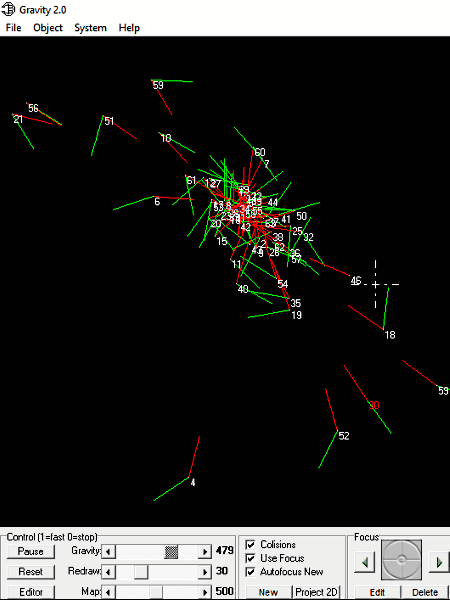 Gravity es mi software de simulación de gravedad favorito. Te permite crear varios objetos y estudiarlos bajo la gravedad de cada uno. Además, denota el vector de fuerza normal y las líneas del vector de velocidad con cada objeto. Por lo tanto, se puede ver el efecto de las fuerzas de una mejor manera. Además, puede guardar/abrir simulaciones en archivos XML .