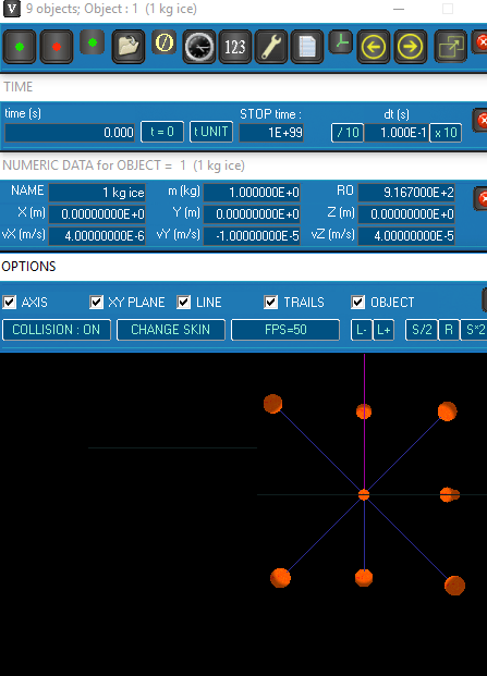 Después de cargar cualquier archivo TXT, puede realizar un seguimiento de la posición del objeto en el espacio tridimensional (direcciones x,y,z), la velocidad (Vx, Vy, Vz), la masa, la densidad, etc. Hay varias opciones relacionadas con la visualización disponibles en su interfaz mediante las cuales, puede activar o desactivar el objeto, senderos, líneas, ejes, etc. para que aparezcan en la pantalla. Además, le permite analizar la simulación a varias velocidades de fotogramas 1 FPS, 2 FPS, 5 FPS, 10 FPS,2 FPS, y 50 FPS.