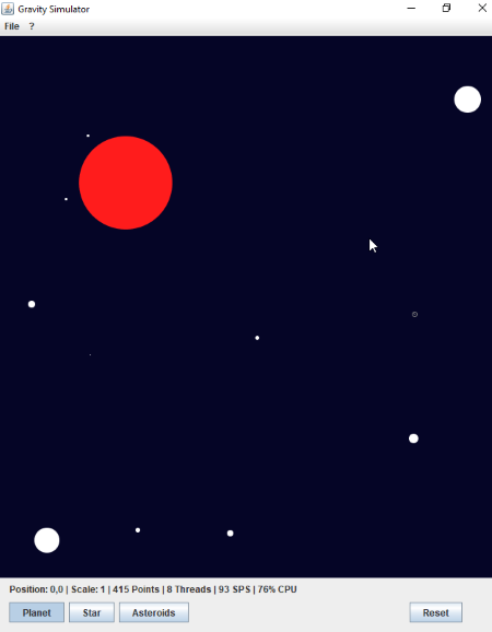 Gravity Simulator es un software simulador de gravedad gratuito basado en Java para Windows. Utilizando este sencillo software de simulación de N puntos, puede analizar el movimiento y el efecto de la gravedad en Planetas, Estrellas y Asteroides entre sí.