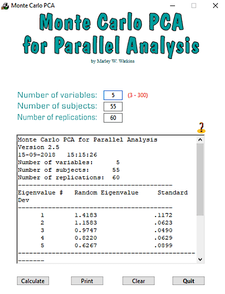 Monte Carlo PCA for Parallel Analysis es un software gratuito para calcular valores propios mediante simulación Monte Carlo. Toma unos pocos datos de entrada, incluyendo el número de variables, el número de sujetos y el número de réplicas y, a continuación, calcula valores propios aleatorios con desviación estándar. Puede imprimir los resultados.