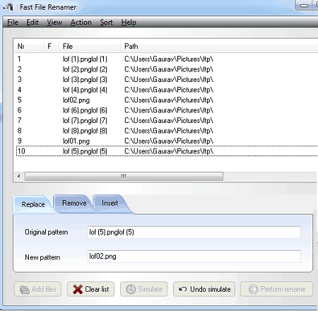 Fast File Renamer es otro programa gratuito para renombrar archivos en Windows. Como la mayoría de los programas similares, también puede renombrar varios archivos a la vez. Además, permite renombrar todo tipo de archivos y documentos. Para renombrar archivos, sólo ofrece tres opciones: Reemplazar (para sustituir un patrón específico en los nombres de archivo por otro nombre), Eliminar (para eliminar un patrón común de varios nombres de archivo), y Insertar (para insertar palabras o números en una posición específica en los nombres de archivo existentes). También dispone de un práctico Modo de simulación para previsualizar los nombres finales de los archivos antes de renombrarlos realmente.