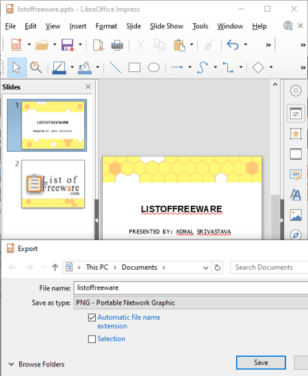 LibreOffice Impress es mi software favorito, ya que puede convertir PPT a PNG, así como a algunos formatos más, como PDF, EPS, SVG, HTML, SWF, etc. Además, es muy fácil de usar y es adecuado tanto para profesionales como para usuarios principiantes.